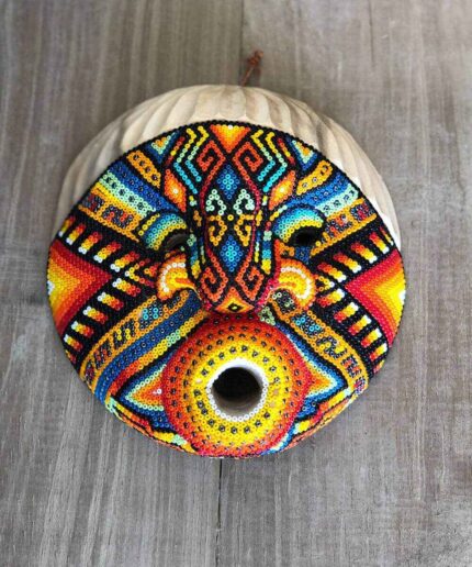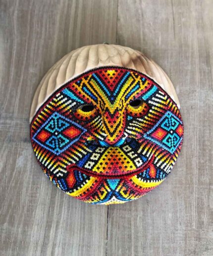 Chaquira mascara is made of hand carved wood and small chaquiras which carry the Ayahuasca Pintas (vision colours). Made by tribal artisans, and it takes more than a week to complete one mask.