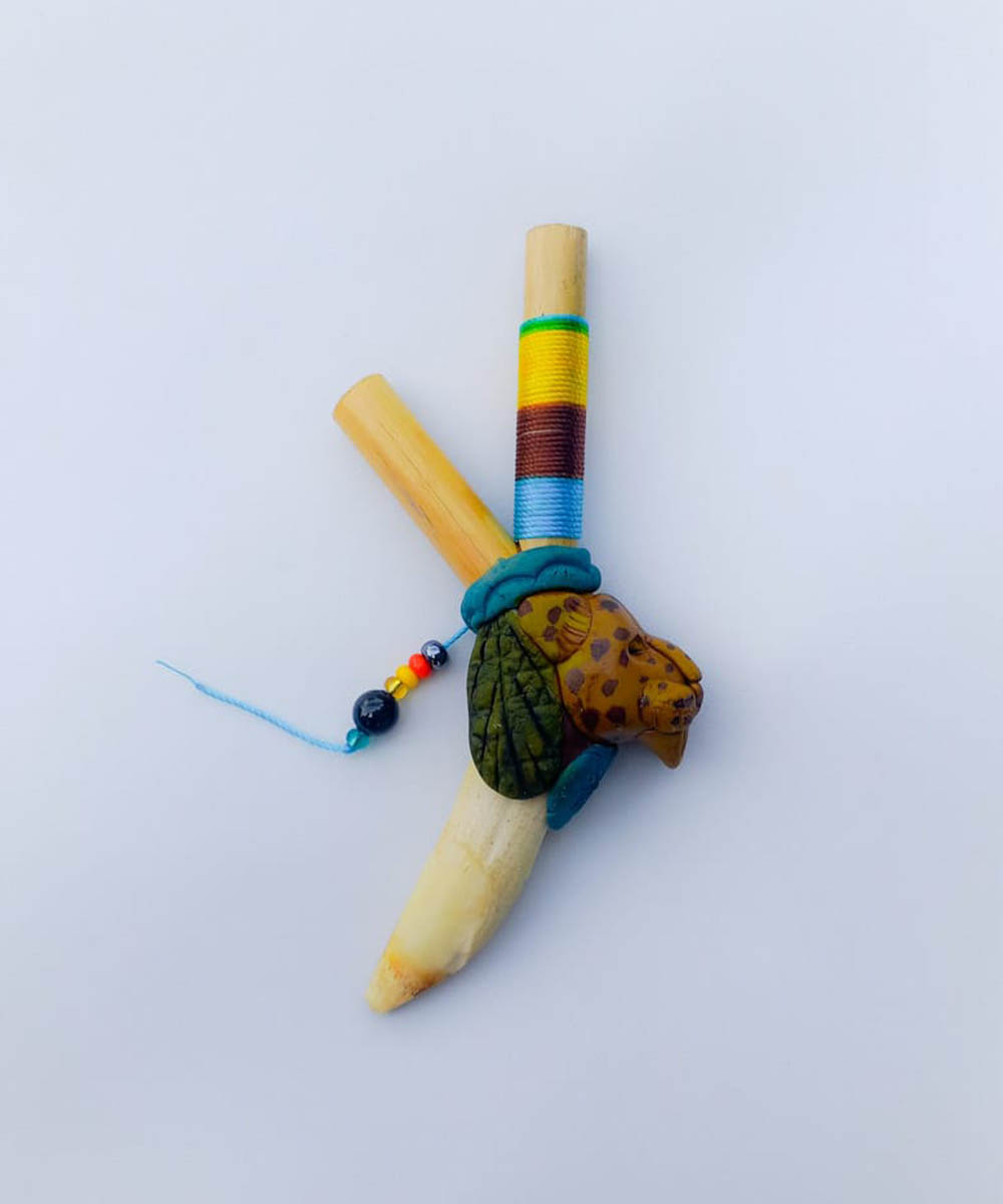 Crafted by Colombian Kamentsa tribe member, this kuripe is made of bamboo and Jabali bone. It is deliberately decoreted by lace, bead and epoxy. As a power animal in shamanism, Jabali represents strength and endurance.