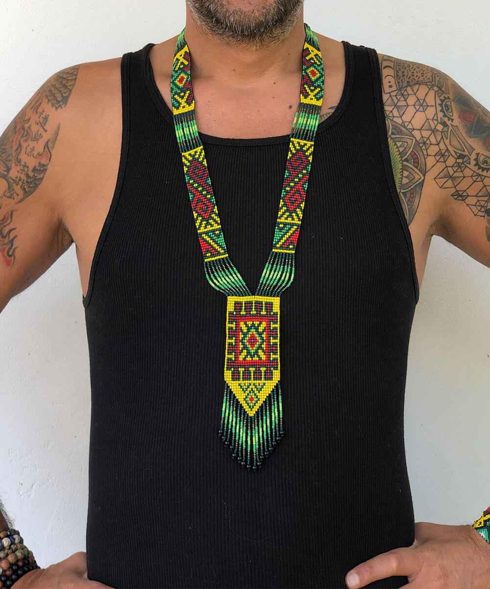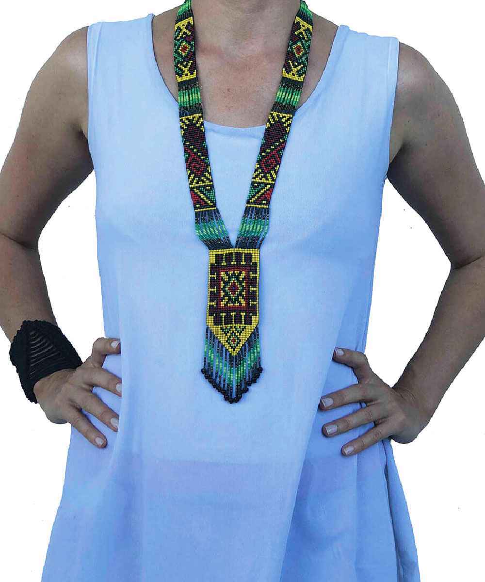 Unique handmade chaquira necklace from KAMENTSA tribe from Sibundoy valley, upper Putumayo(Amazon) Colombia. These necklace designs are ancient traditional symbols of the Kamentsa tribe, from the times they were carved on the rocks, now same symbols are available in the necklace form. As most of these symbols are visions from the sacred plant ceremonies It is said that, people wearing this symbols and colors during the ceremony are recognized by the plan spirits and welcomed on the astral plane.
