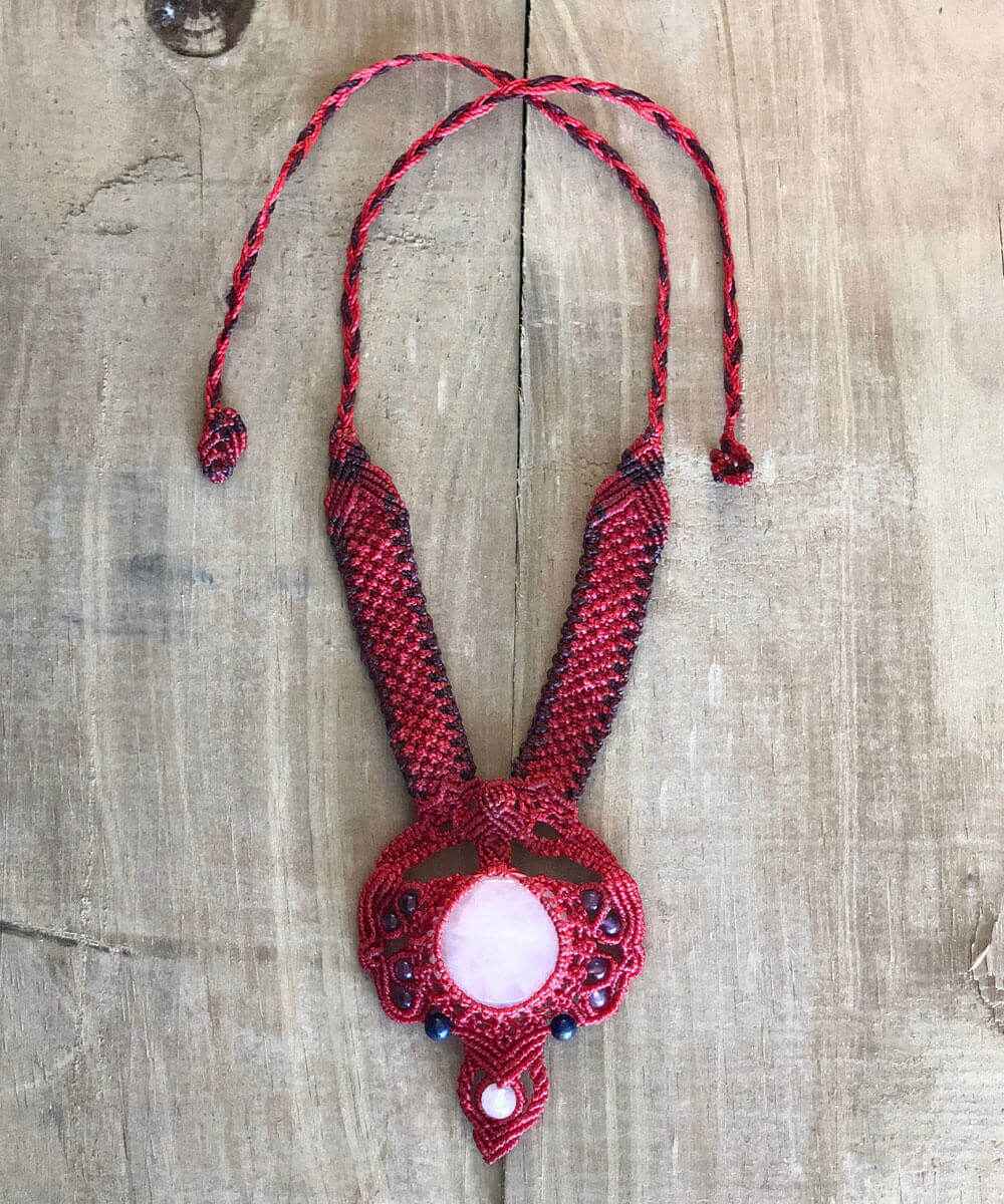 Beautifully designed red macramé necklace decorated with a big and a small moon stone which is stone of the mother moon, deep healing waters, and sacred feminine energies. it brings soothing, healing, calm energy and helps regain your power and inner balance. And amethyst crystal is a meditative and calming stone which works in the emotional, spiritual, and physical planes to promote calm, balance, and peace.