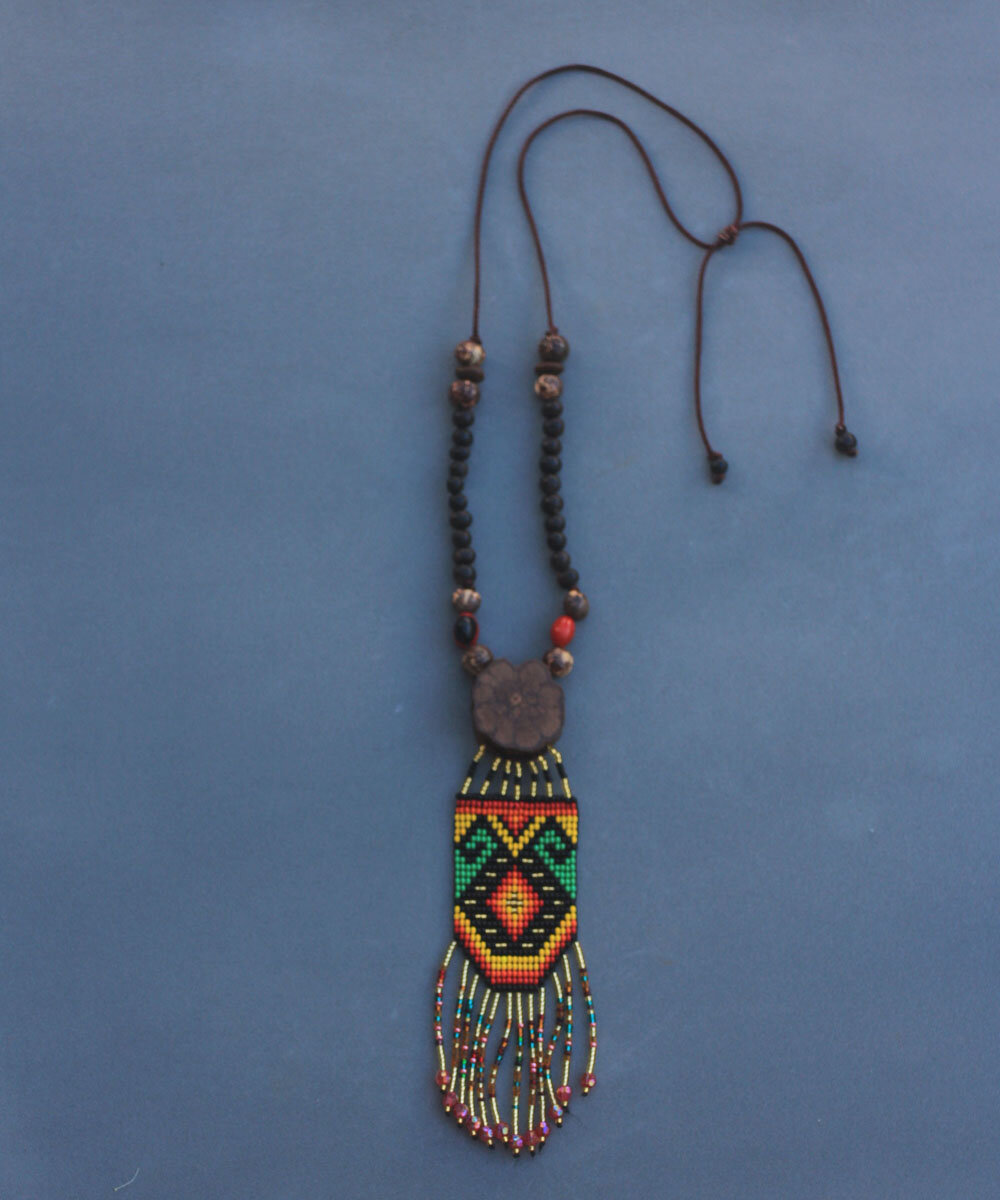 Special necklace mostly for ceremonial use or cure people, carrying the ayahuasca ivy as a necklace and decorated with chocho(huayruro) seeds making it a really powerful element for any ocaion. This necklace also has yage/ayahuasca visions design as bead.